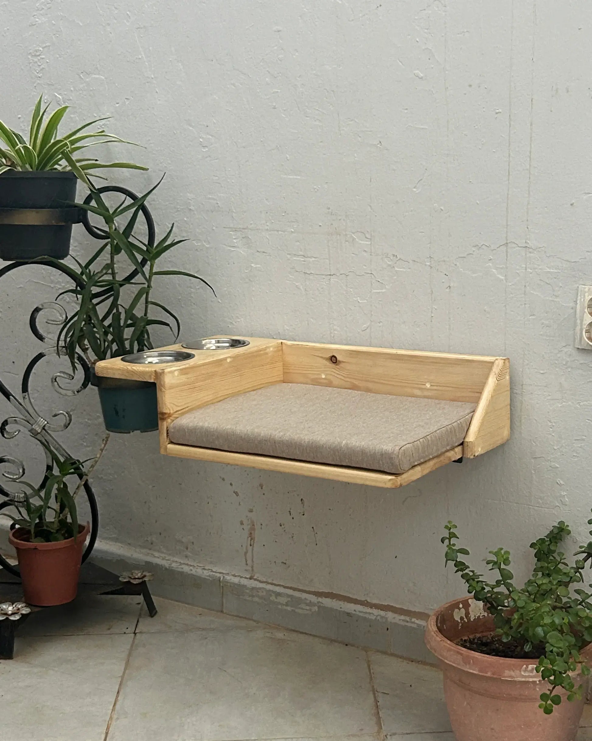 سرير جداري عائم للقطط مع أوعية طعام مزدوجة – تصميم أنيق ومريح